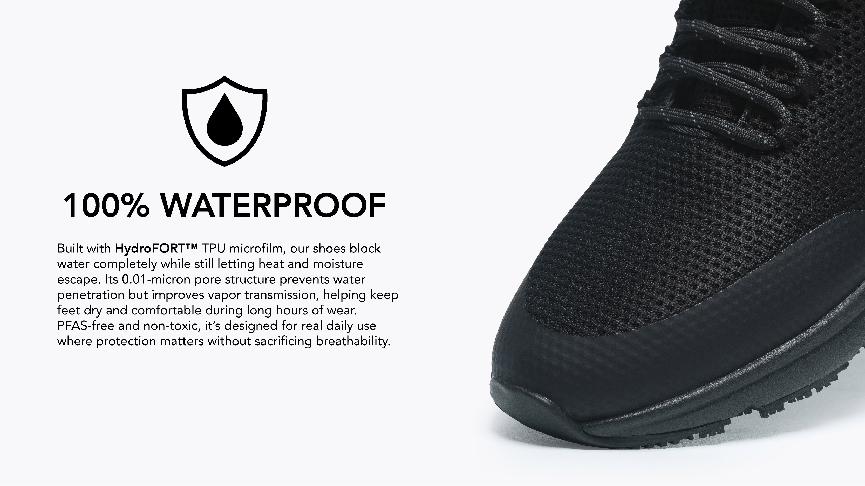 ISO 測試認證,HydroFORT 100% 全防水,鞋舌兩側擋水結構