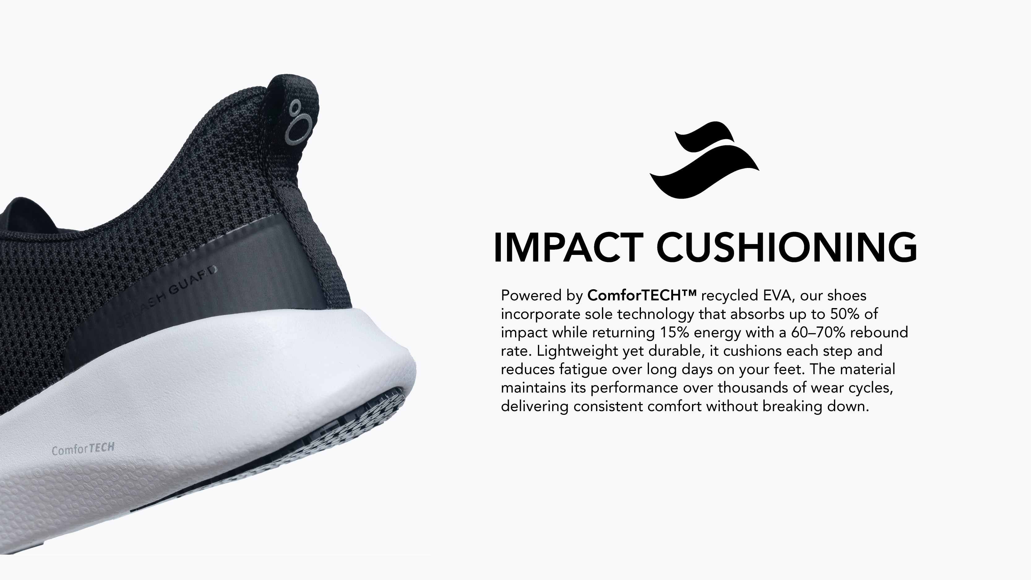 鞋墊由可回收的 EVA 物料製成,設計貼合腳形、柔軟富彈性、防震保護和富有回彈性,讓行走時更加自在舒適。