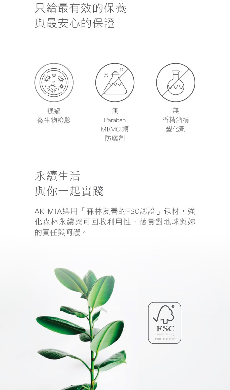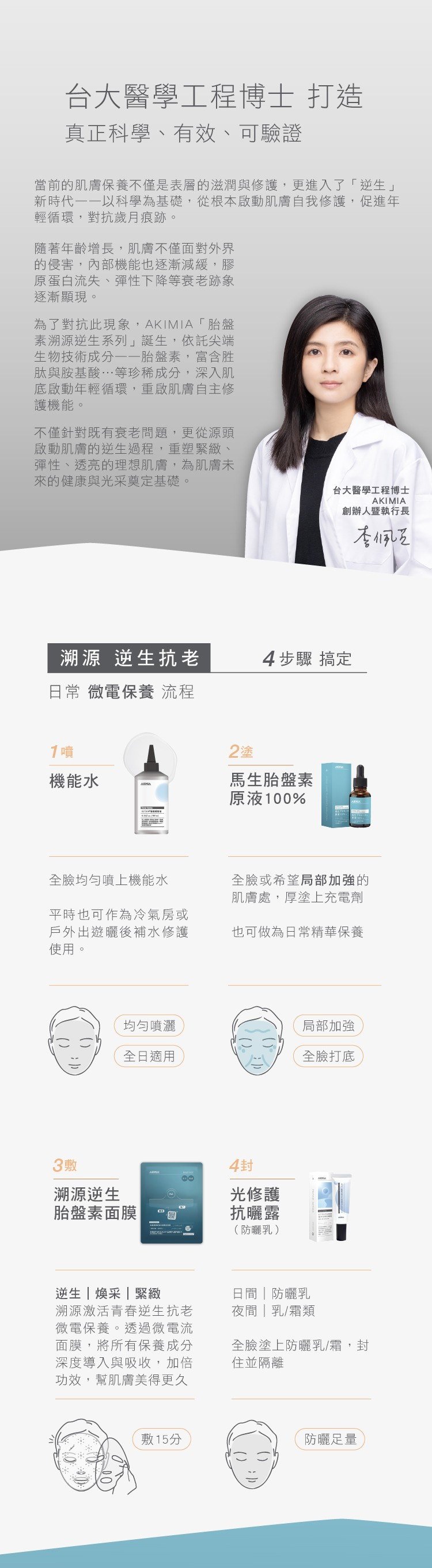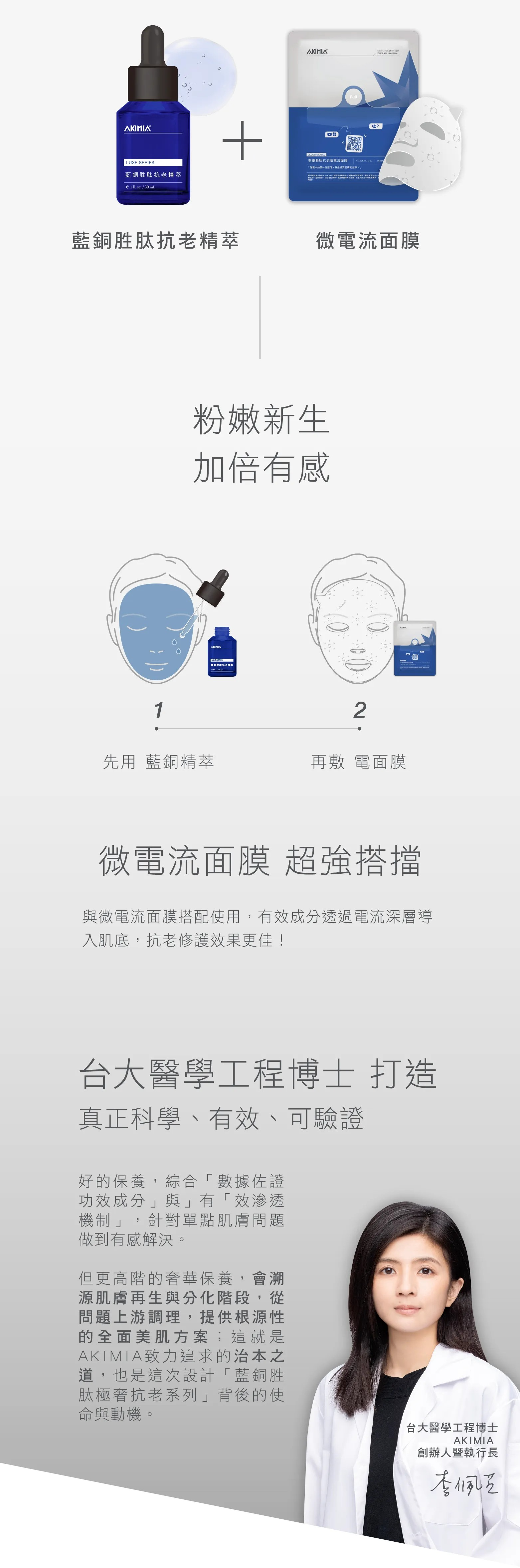 AKIMIA推薦每週三次,於潔顏後,全臉塗抹/噴霧,再搭配微電流面膜敷用,達到深層滲透、加倍功效的修護保養!