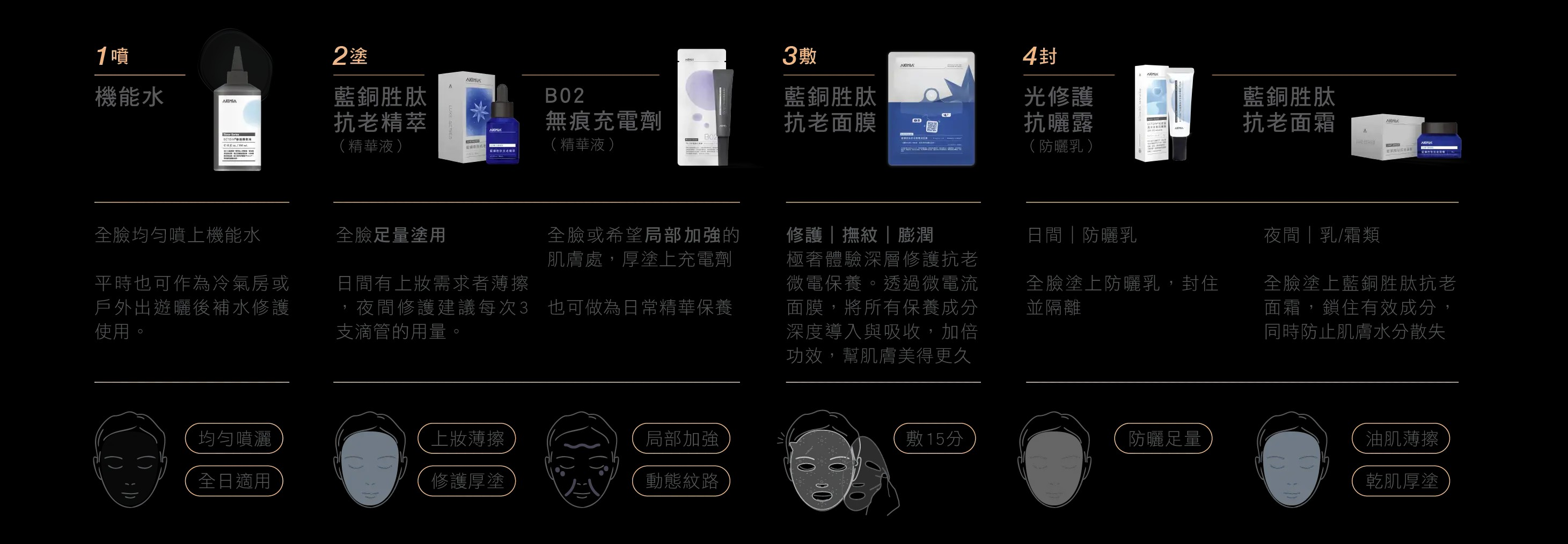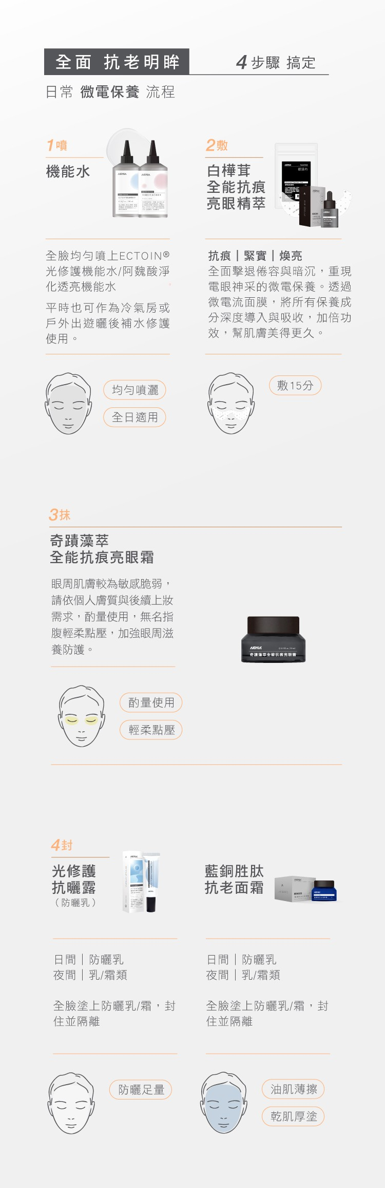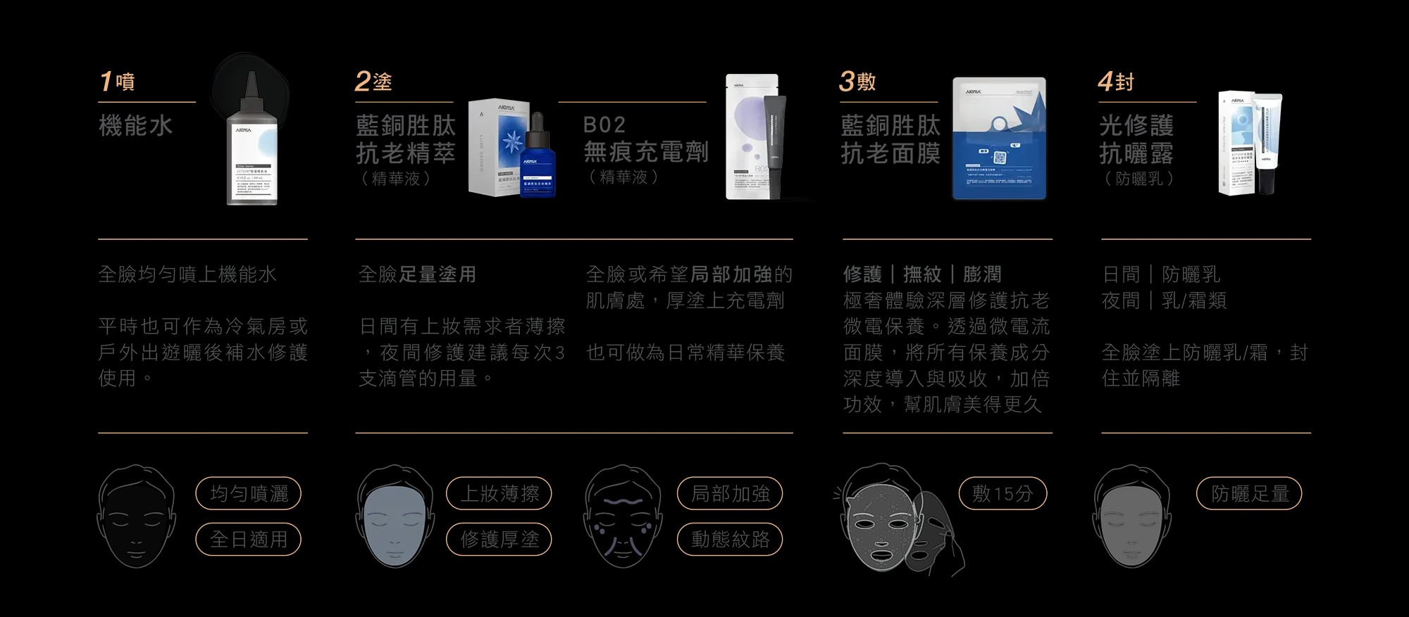 AKIMIA推薦每週三次,於潔顏後,全臉塗抹/噴霧,再搭配微電流面膜敷用,達到深層滲透、加倍功效的修護保養!