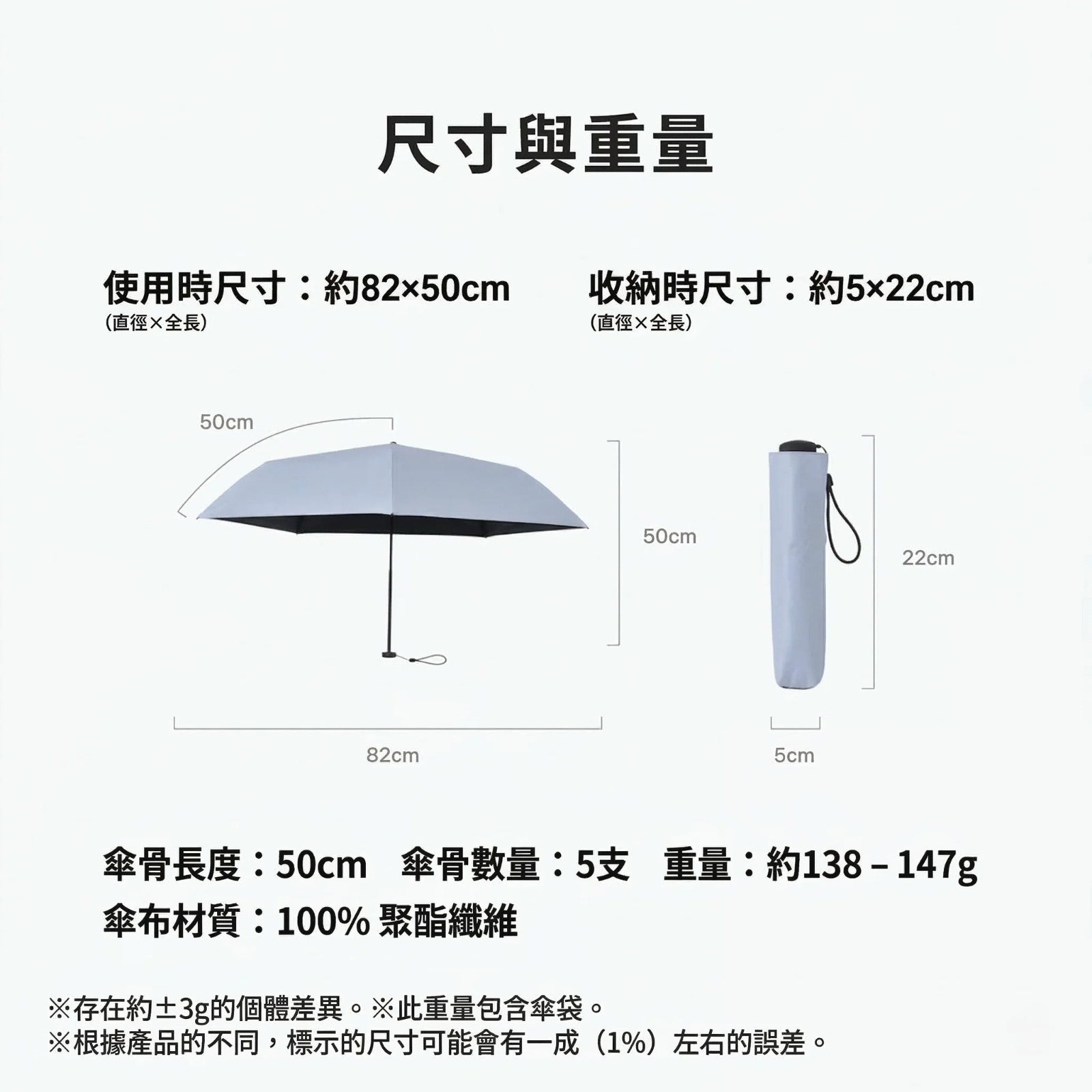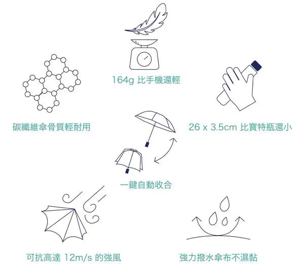 一般的自動摺疊傘,基於便利的構造設計,重量大約在310-400g 。生活在多雨氣候的地方,每天攜帶著雨傘已成為日常,這時候雨傘重量卻成為每天攜帶的負擔...