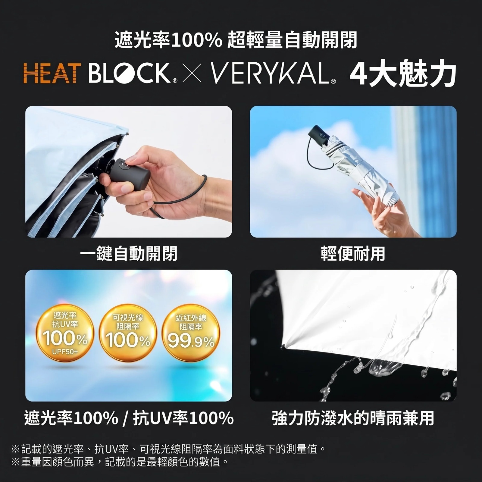 VERYKAL 8 採用的抗UV傘布,可以阻隔紫外線,波段外的可見光仍可通過,不聚焦、不反射,不只輕薄還能作為日常的遮陽傘使用,抗UV率最高達91%!