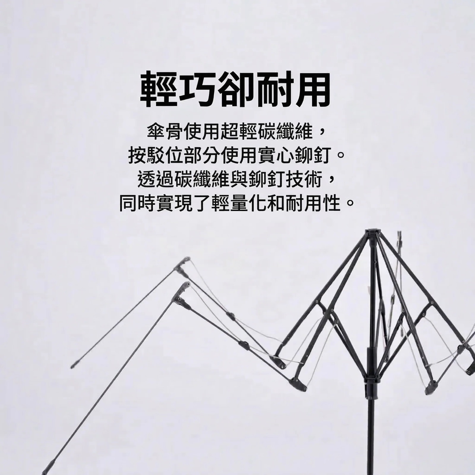 骨架為三段彎曲結構,前兩段採用的是碳纖維,由於其輕盈、耐用、高彈性、高強度的特性,經常用於飛機等航太交通工具的材料,因此傘骨架可以做得輕量卻堅固。