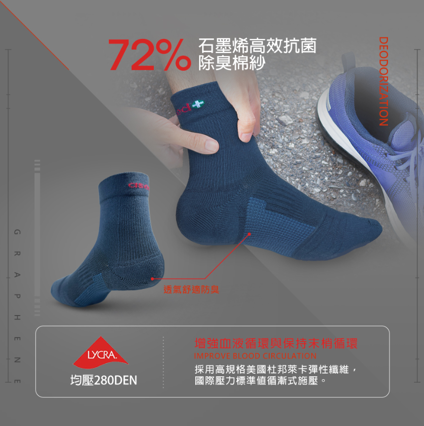 ●72%石墨烯高效抗菌除臭棉紗,採用高規格美國杜邦萊卡彈性纖維,國際壓力標準值循漸式施壓