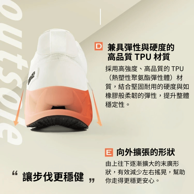 前翹加上無後跟的設計,走路時重心自然從腳跟滑順移到腳尖,走起來更輕鬆、更順,還能偷偷啟動體幹,讓每一步都更有力又穩定。