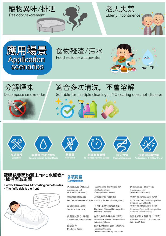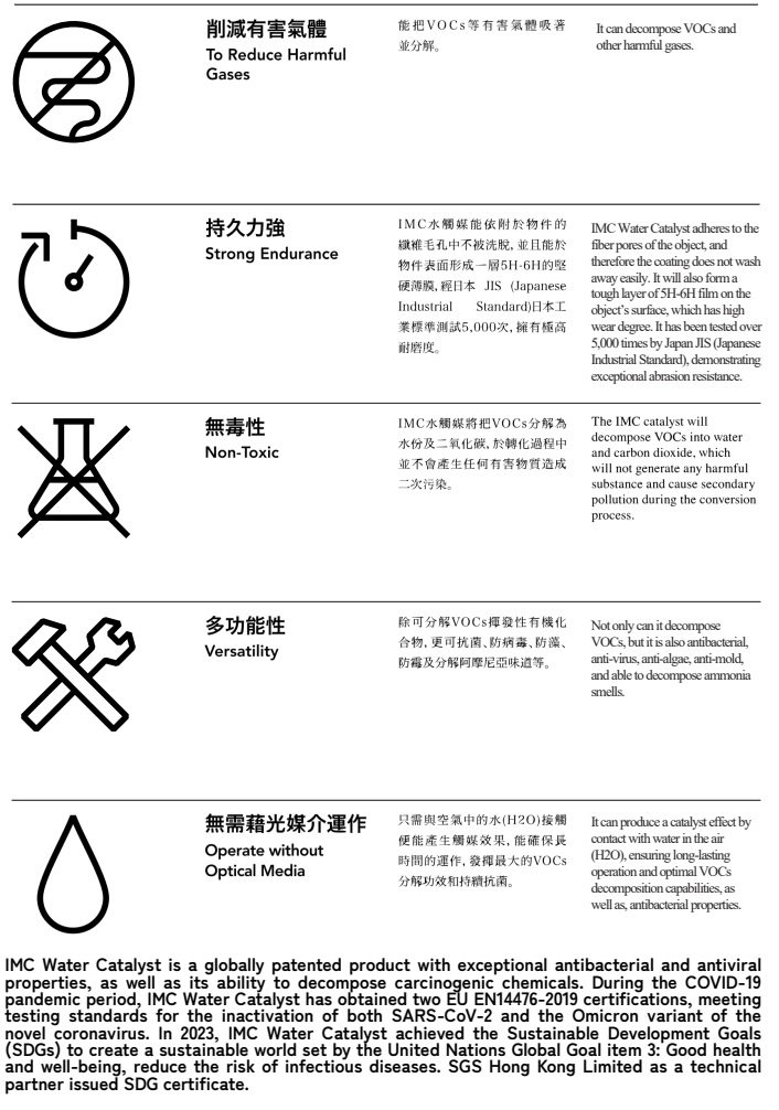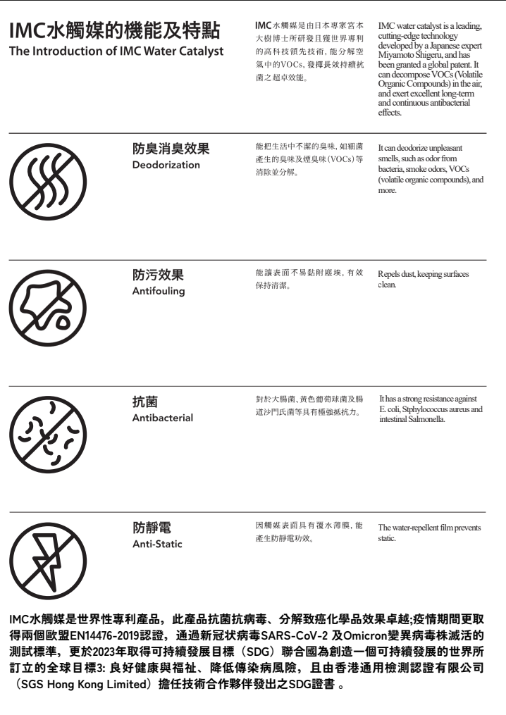IMC水觸媒是由日本研究所研發且獲世界專利的高科技領先技術,能分解空氣中的VOCs/甲醛,持續發揮抗菌抗病毒效能。
