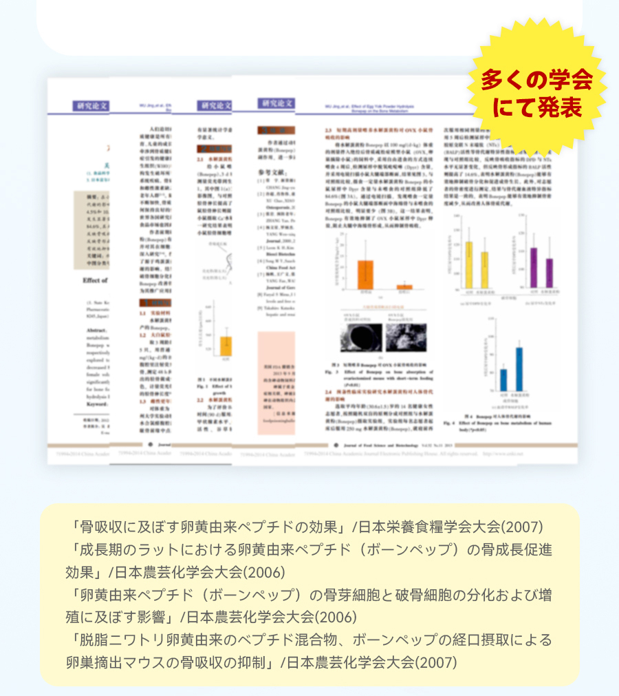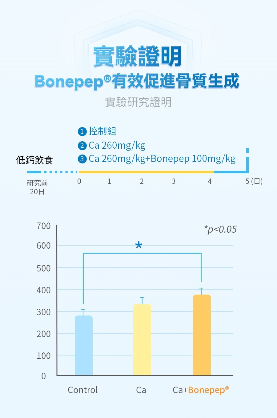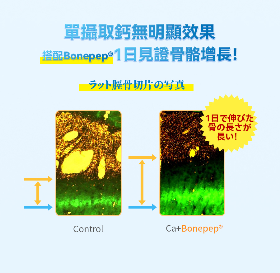 Bonepep與鈣並用,促進骨質生成,有效提升骨骼長度;在日本栄養食糧学会大会/日本農芸化学会大会及其他等多篇國際學術論文研究得出:
