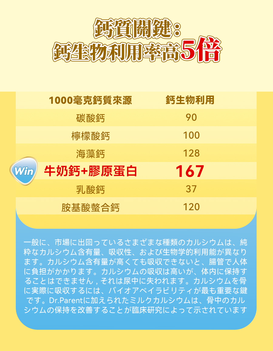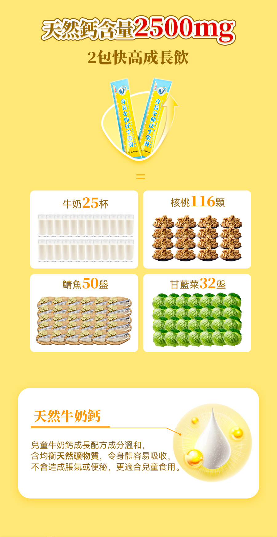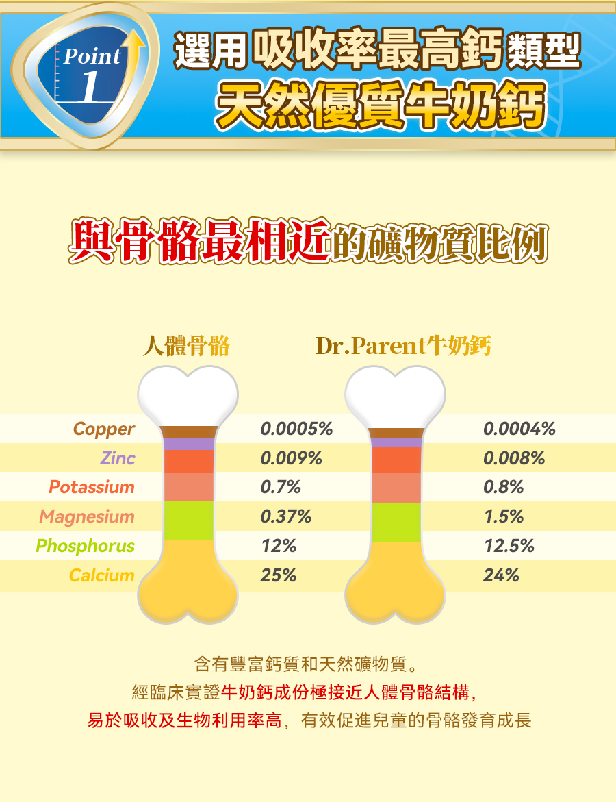 選用的天然牛奶鈣結合乳酸鈣,可以提高鈣質保留在骨質中,且具備更高的生物利用率促使鈣質發揮更大促進高成長的作用。