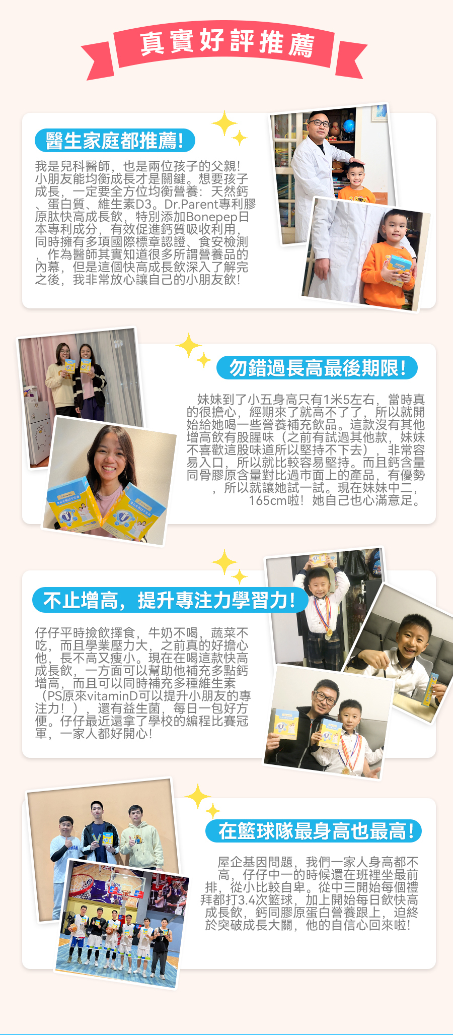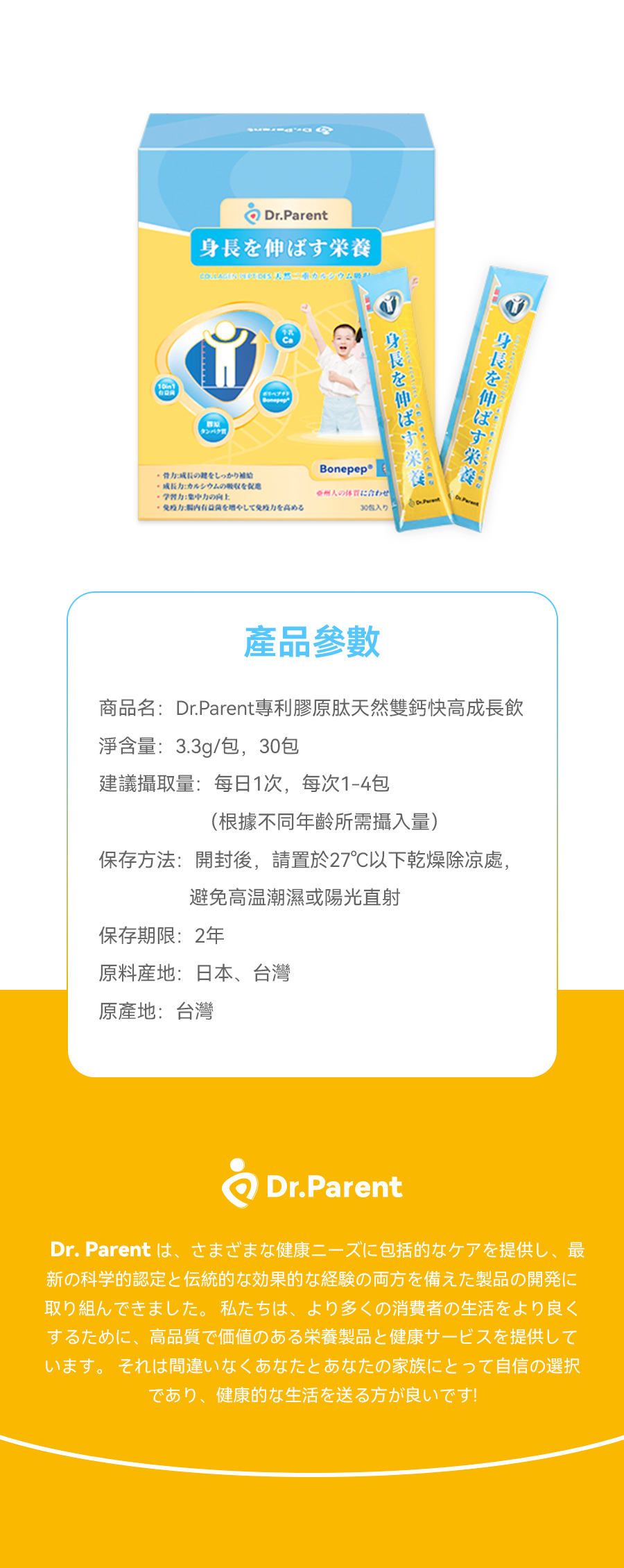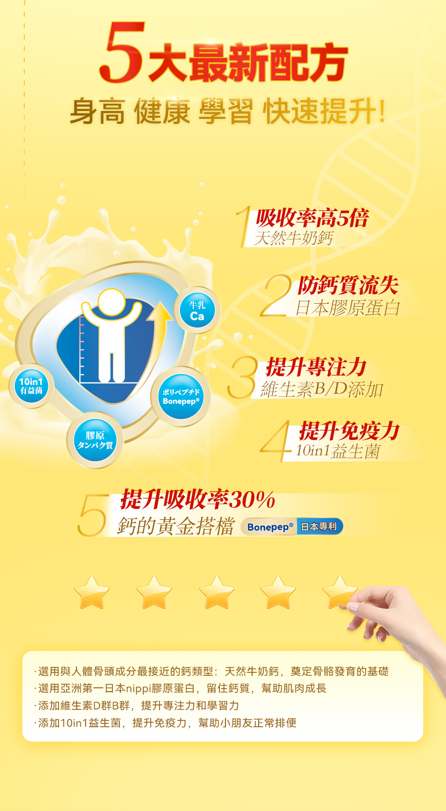 1.四效合一促成長:日本NIPPI Peptide®骨膠原小分子勝肽+Bonepep®專利高吸收成長多肽+維生素+天然牛奶鈣協同作用,