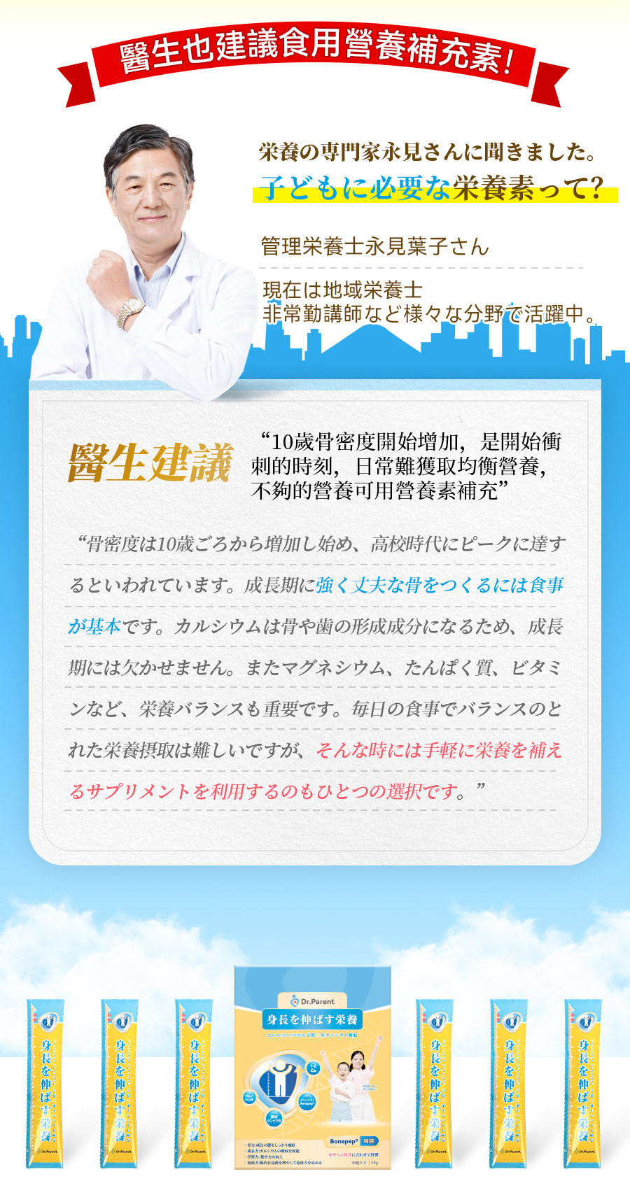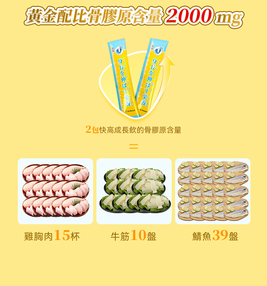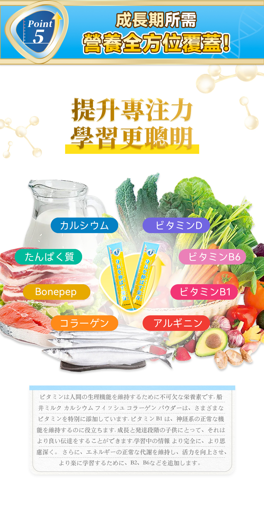 1.四效合一促成長:日本NIPPI Peptide®骨膠原小分子勝肽+Bonepep®專利高吸收成長多肽+維生素+天然牛奶鈣協同作用,