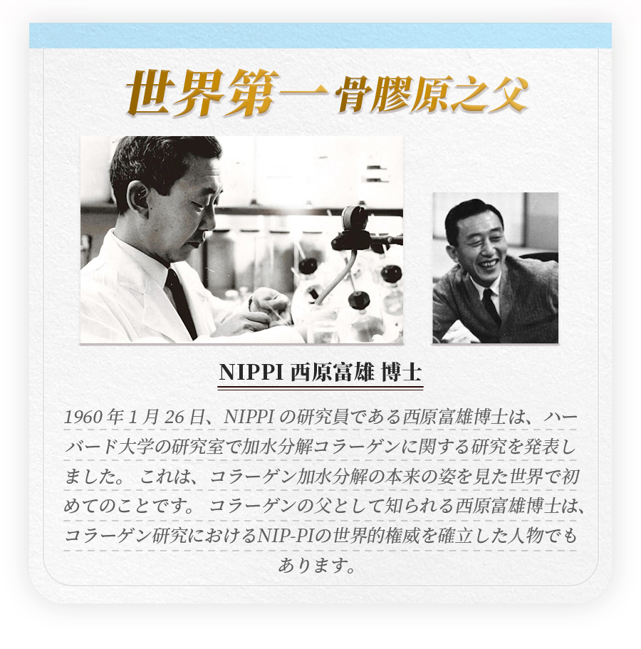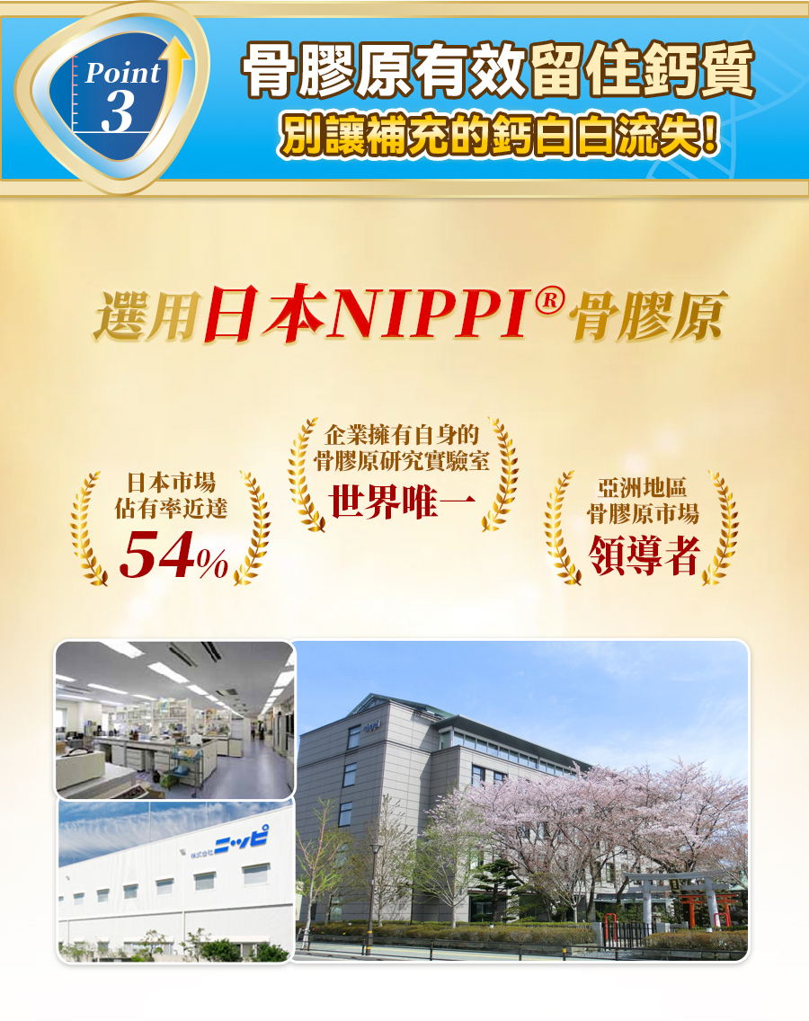 我們選用全球唯一的膠原蛋白專業研發中心Nippi Biomatrix 研究所旗下的優質日本日本NIPPI Peptide ®骨膠原小分子勝肽,