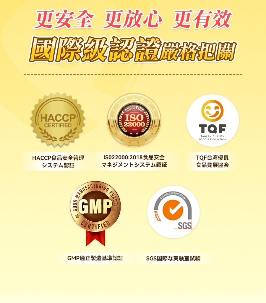 並連續獲得Monde Selection國際獎項以及日本食品產業技術功勞獎等十幾項獎項及專利,經SGS認證無重金屬/香料/荷爾蒙激素/色素/防腐劑等,食用更加安全放心。