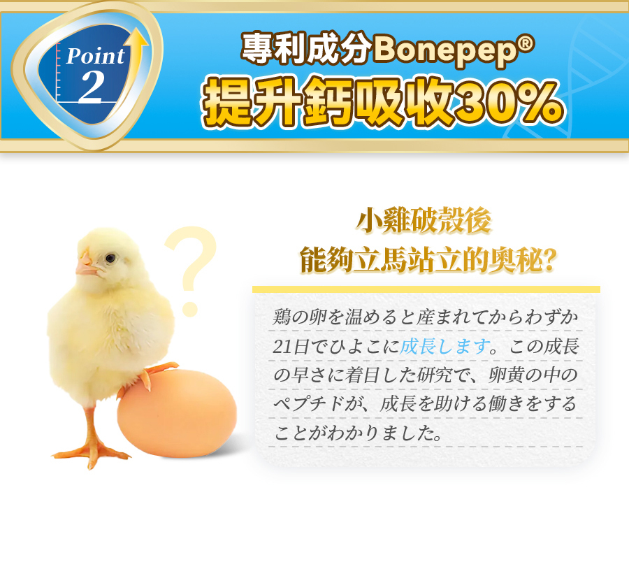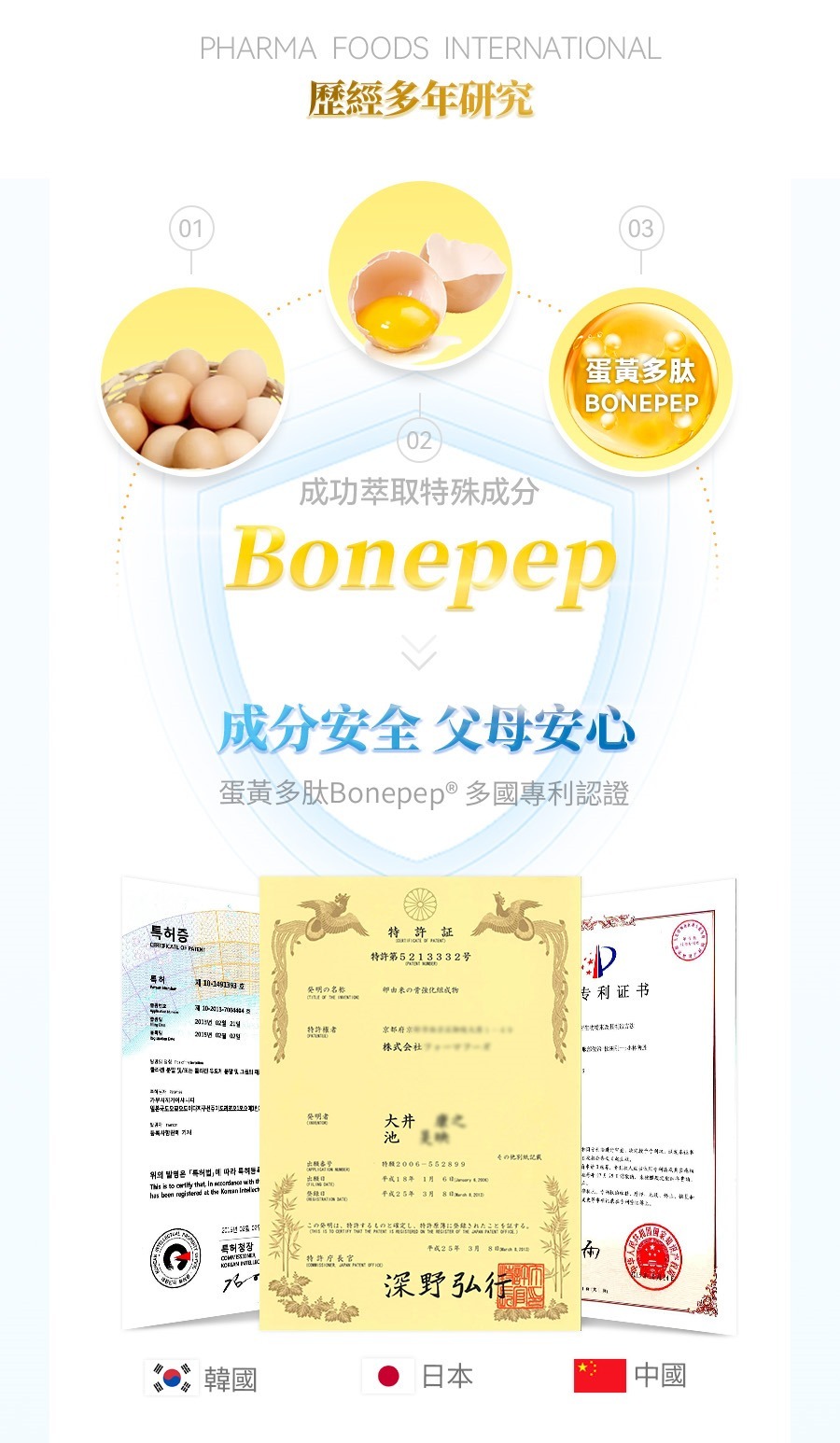 2.專利成分Bonepep®:選用日本專利酶解技術提取Bonepep®專利高吸收成長多肽,活性肽小分子更易吸收,