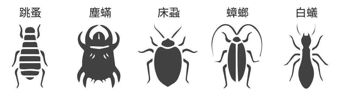 床蝨、塵蟎、蟑螂、蟻類、衣魚、卜泥、姬薪蟲、白蟻