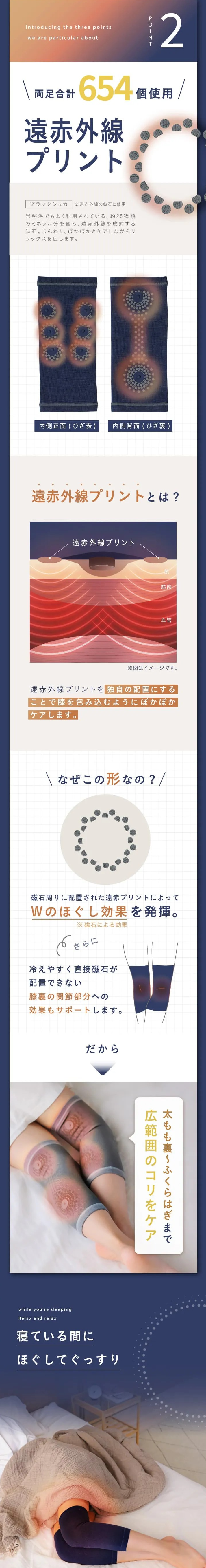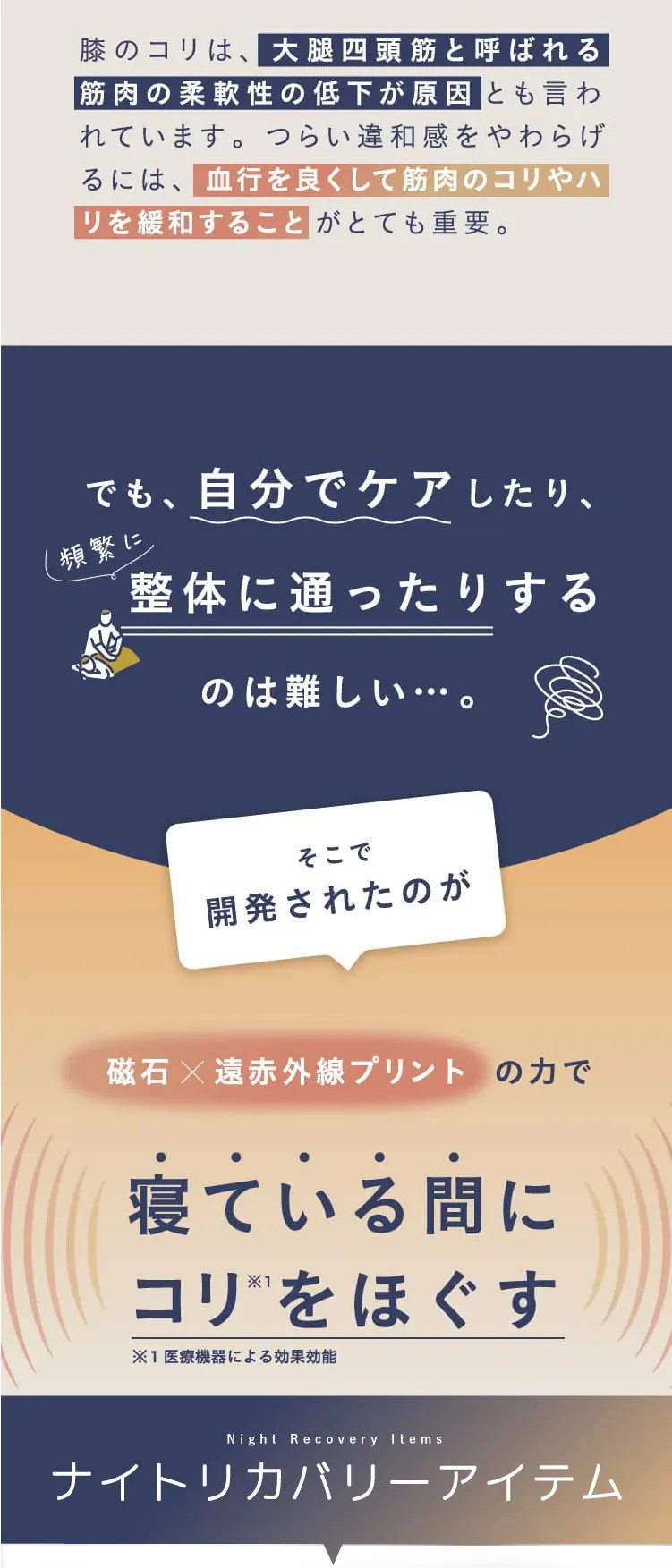 睡眠磁性護膝彈性材質透氣及有彈力(伸縮材料),磁通密度是150mT,內置16個永久磁鐵和654個遠紅外線,而且不含藥物成份,這種磁場可以刺激膝關節附近的神經末梢,促進血液循環,緩解肌肉緊張和關節疼痛。