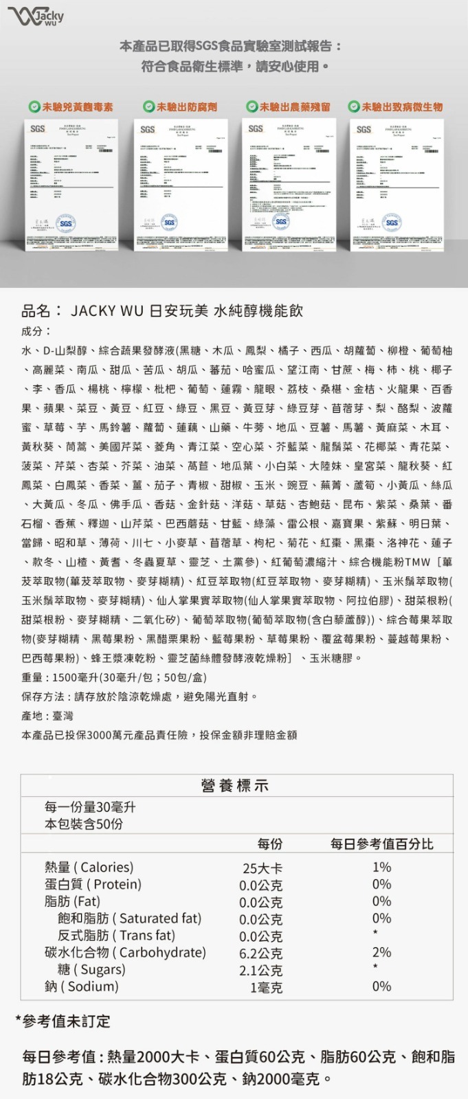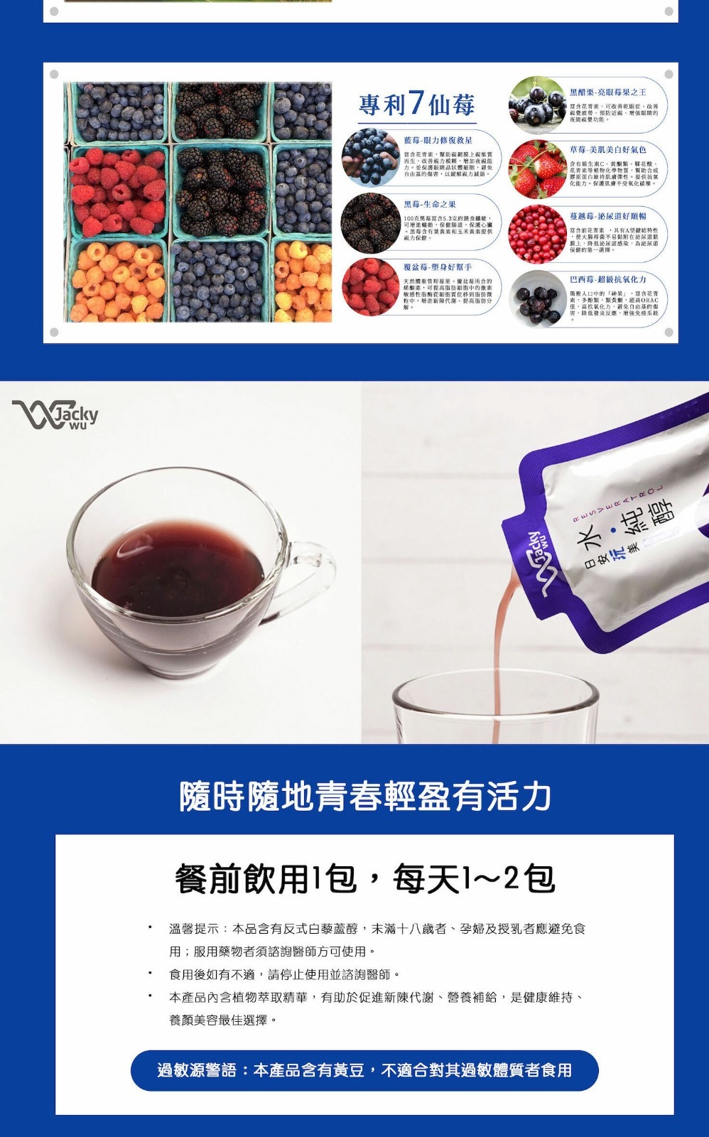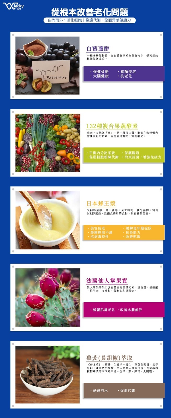 ✴富含葡萄萃取(含白藜蘆醇)、專利七仙莓(綜合莓果萃取)、日本蜂王漿、蓽茇萃取、132種綜合蔬果發酵、玉米鬚萃取物、紅豆多酚、