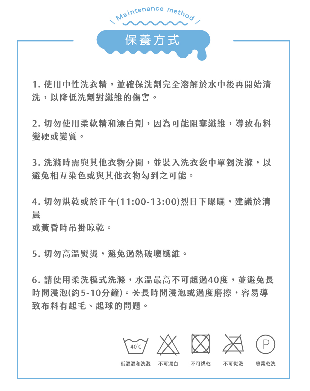 .清潔保養方式:可水洗、可乾洗、不可漂白、不可烘乾。