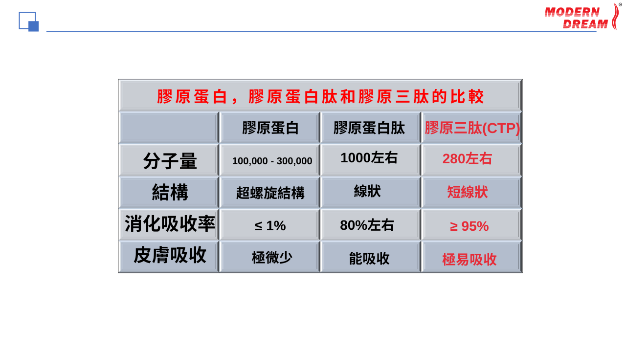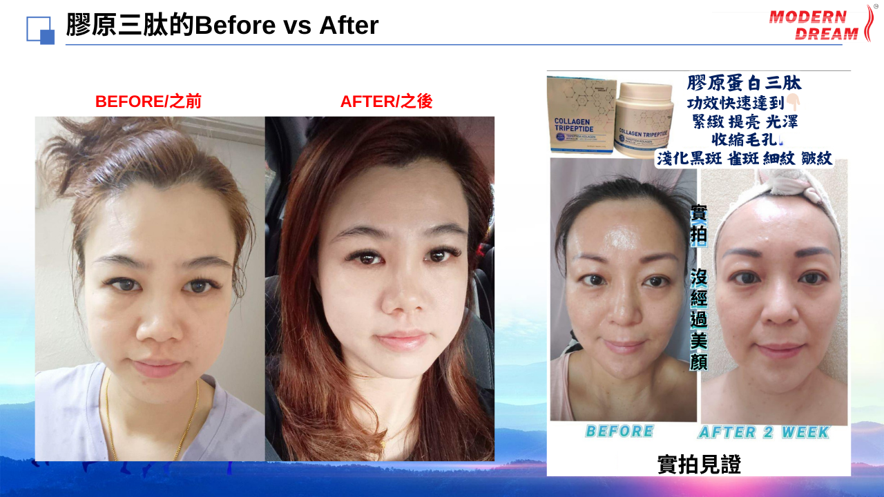 Modern Dream的膠原三勝肽以魚鱗,魚皮為原料,採用先進的定向生物酶切技術及低溫膜分離技術萃取的小分子勝肽,