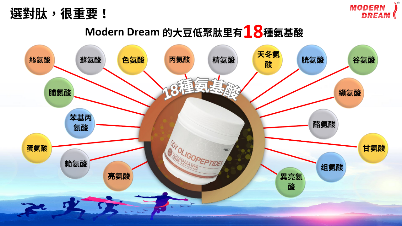 Modern Dream的大豆低聚肽裡有90.44%氨基酸, 含18種氨基酸