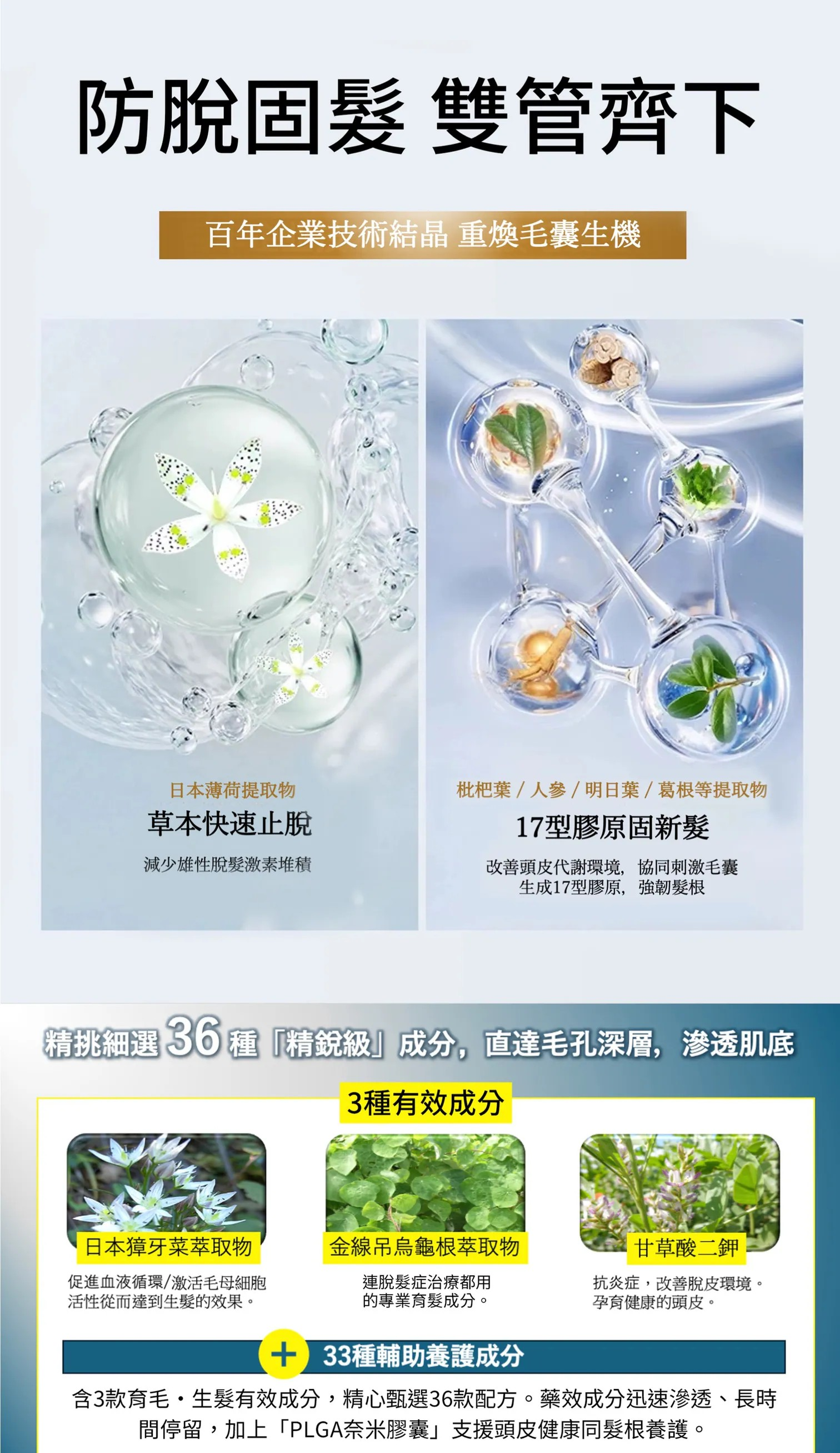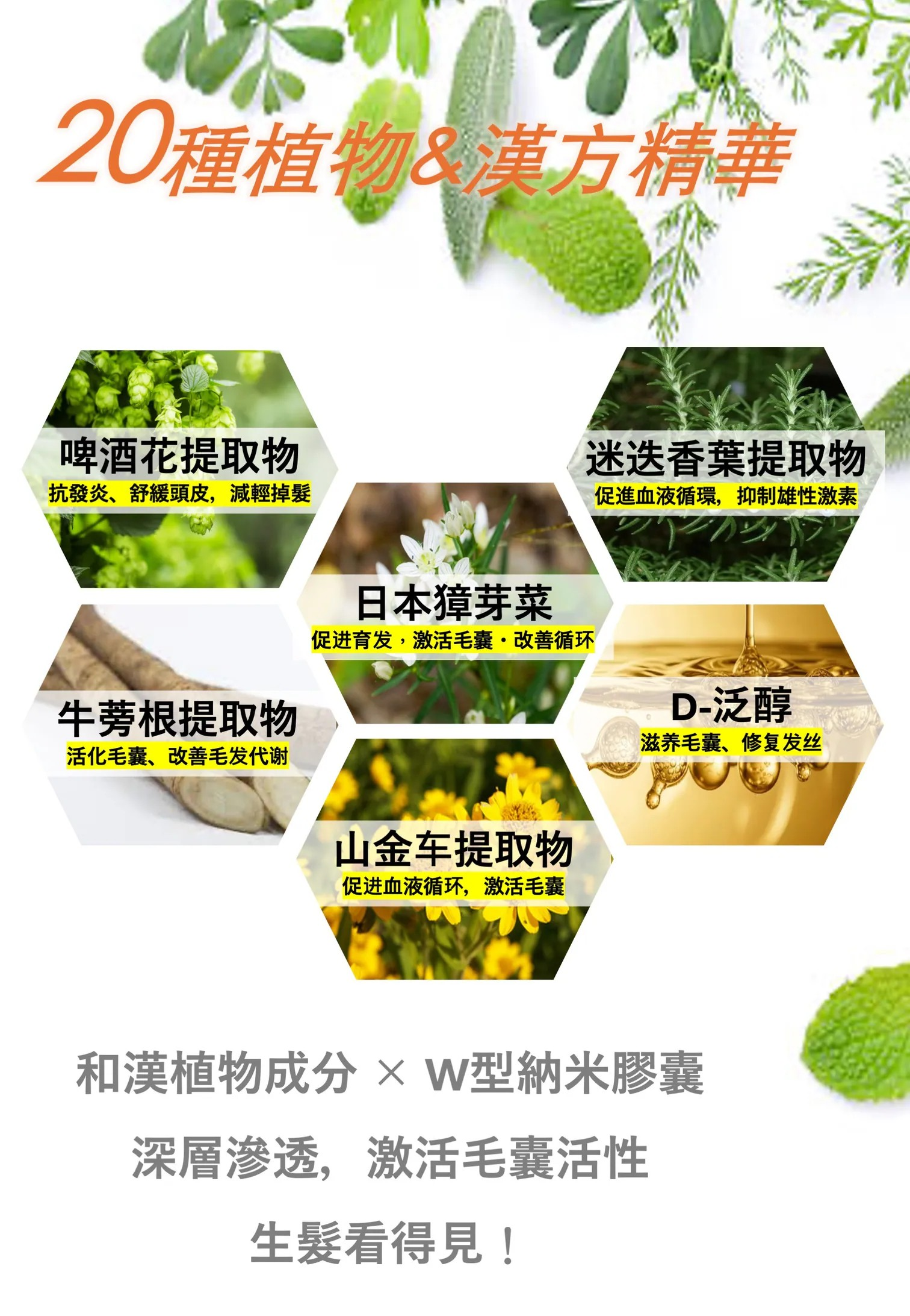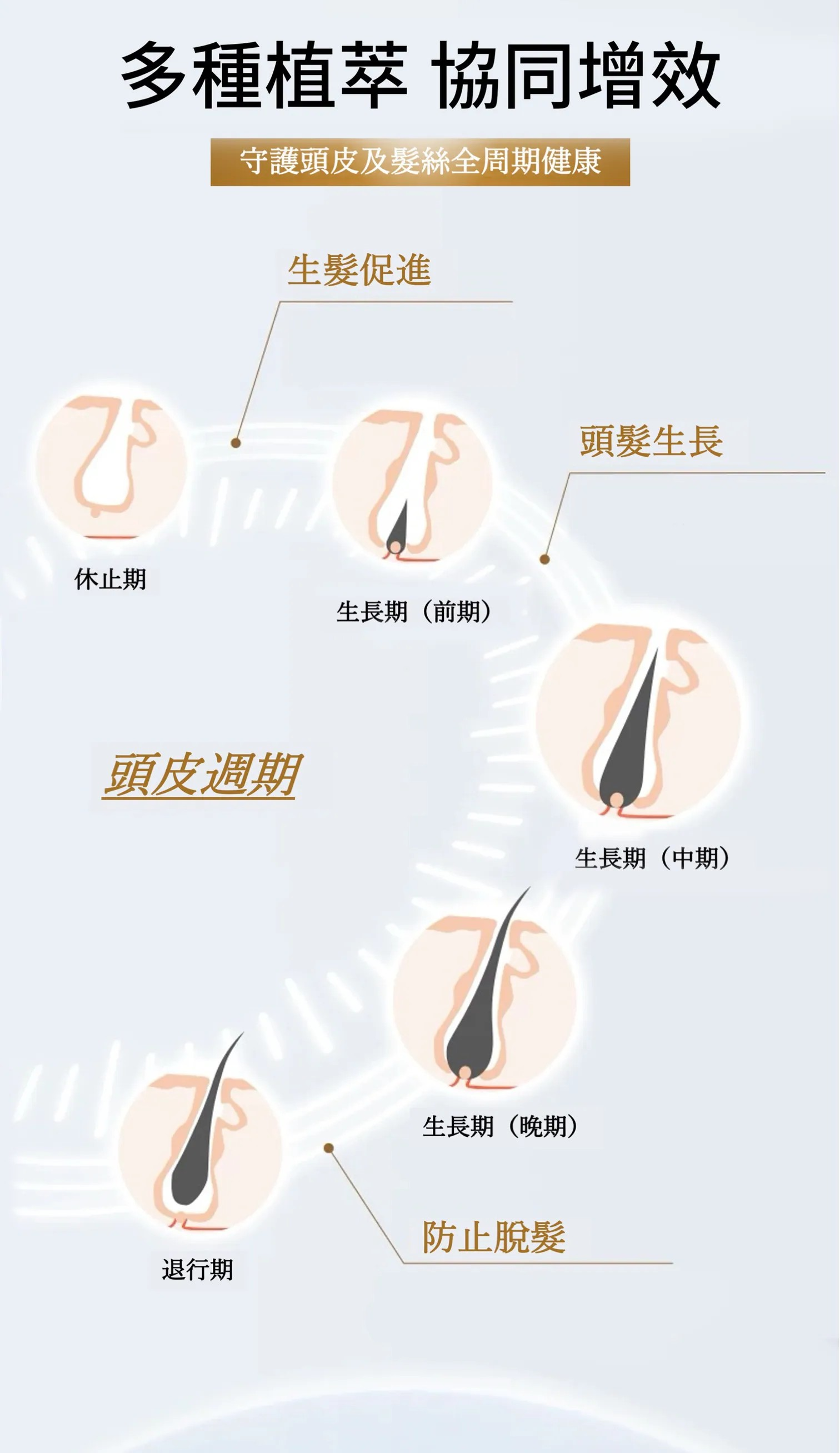 多種植萃 協同增效 守護頭皮及髮絲全周期健康: 生髮促進 》 頭髮生長 》 防止脫髮