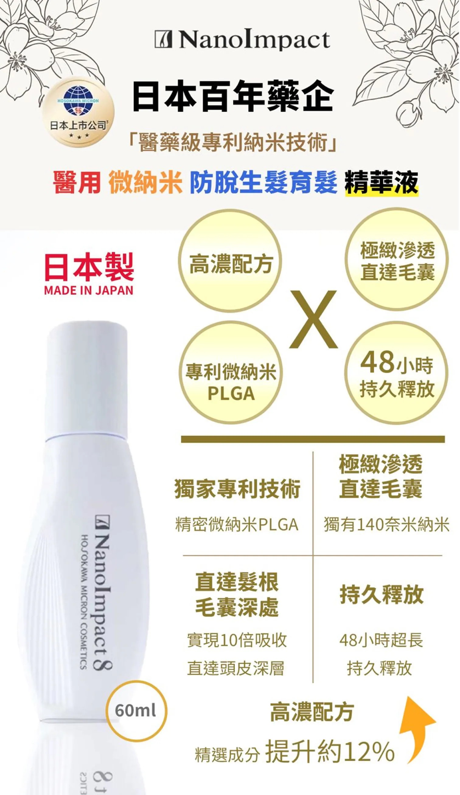 每支(60ml)所含的 PLGA 納米膠囊以 120 萬億顆的高濃度製成,將多種活性成分細緻包裹於納米載體之中,更精準地輸送至髮根毛囊深處。