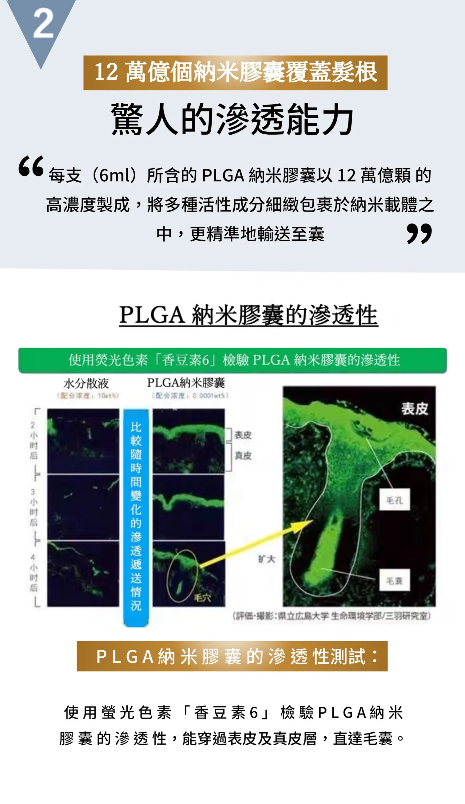 使 ⽤ 熒 光 ⾊ 素 「 ⾹ ⾖ 素 6 」 檢 驗 P L G A 納 ⽶ 膠 囊 的 滲 透 性,能穿過表皮及真皮層,直達毛囊。