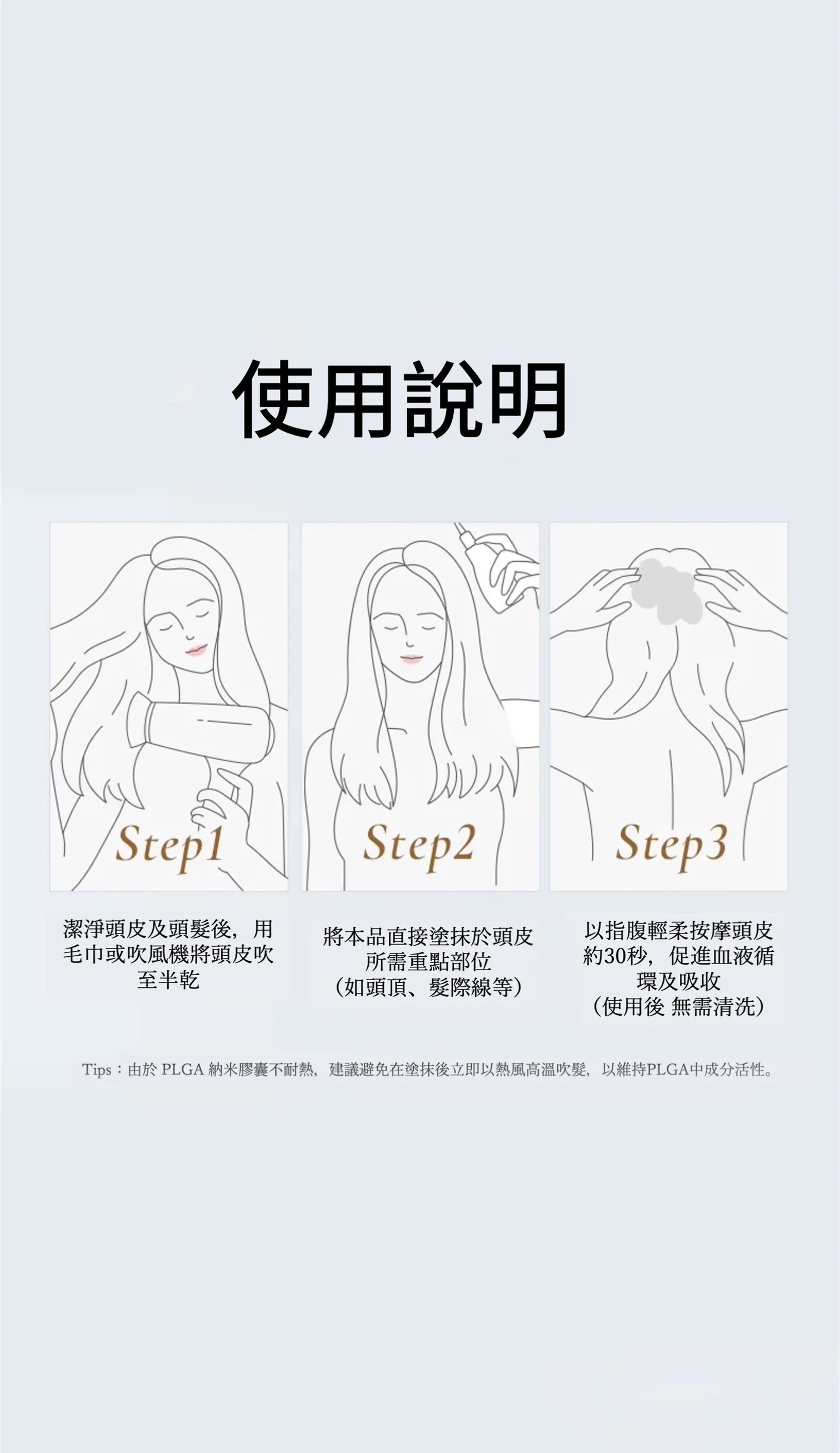 Step 3: 以指腹輕柔按摩頭皮約30秒,促進血液循環及吸收(使用後 無需清洗)