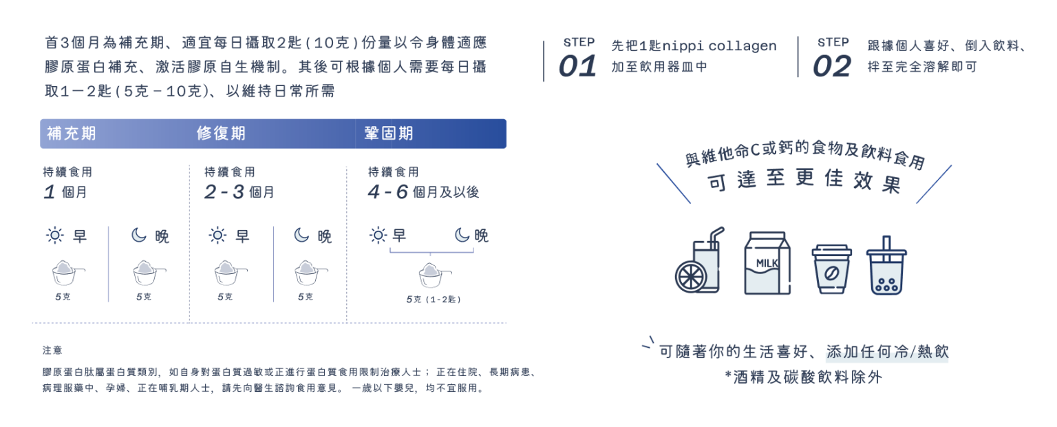 持續服用nippi collagen 100可補充及維持體內所需的膠原營養,高效減低因缺乏營養以致的損傷機會。