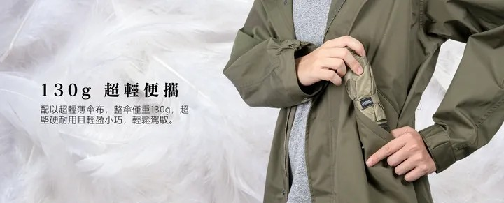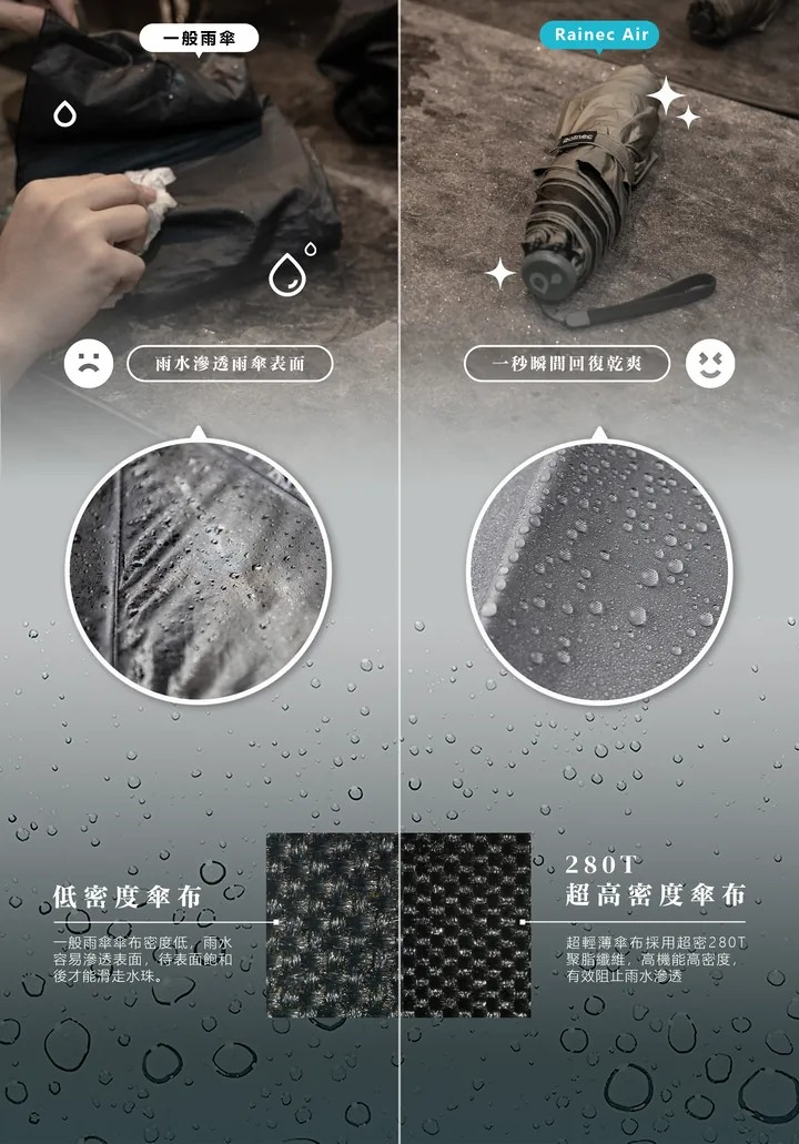 超輕薄傘布採用超密280T 聚脂纖維,高機能高密度,有效阻止雨水滲透。