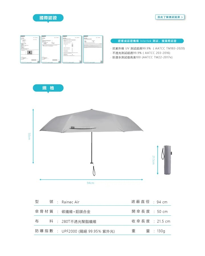 經專業驗證抗紫外線測試 AATCC TM183-2020,抗紫外線指數 UPF2000,阻擋 >99.9% 紫外線,隔絕紫外光穿透,能同時作為防曬傘使用,保護您的肌膚,防止老化。