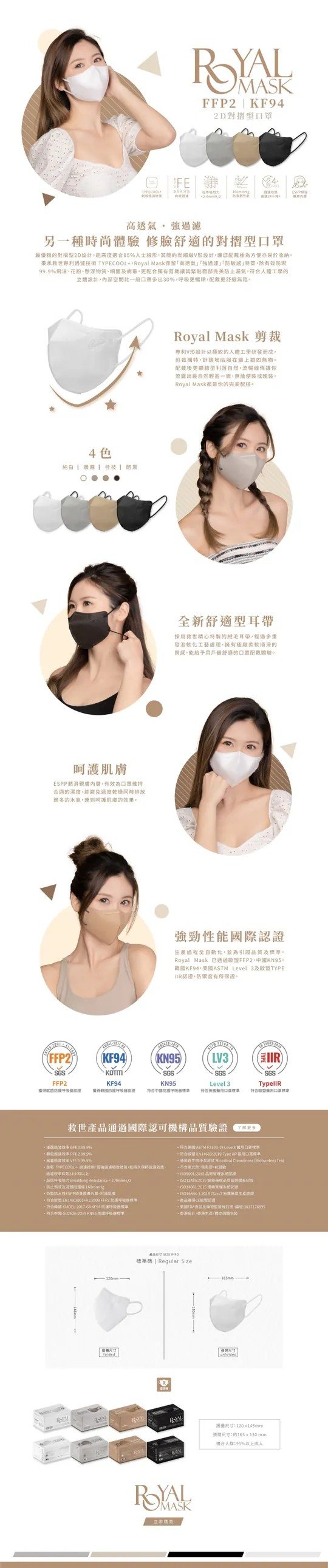 生產過程全自動化,並為引證品質及標準,Royal Mask 已通過韓國KF94、中國 KN95、美國ASTM Level 3、歐盟TYPE IIR認證,防禦度有所保證。