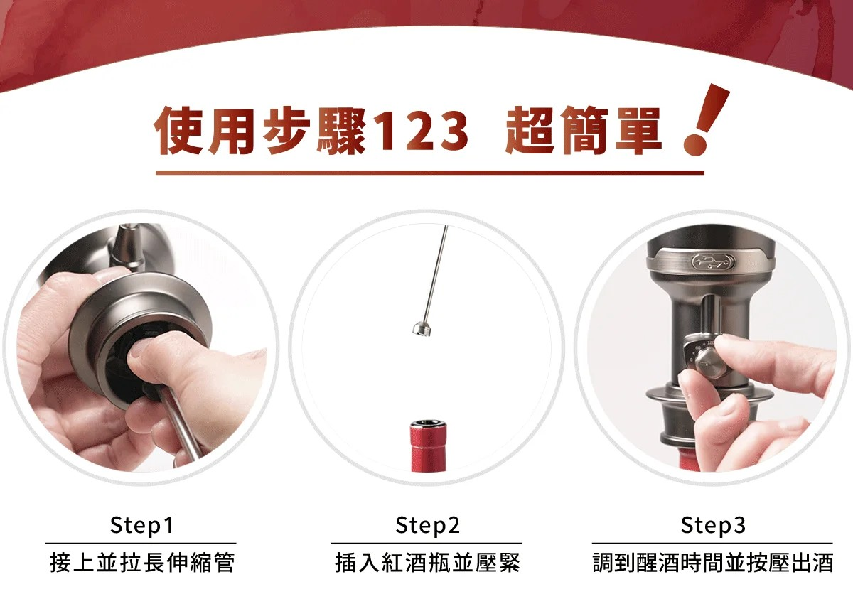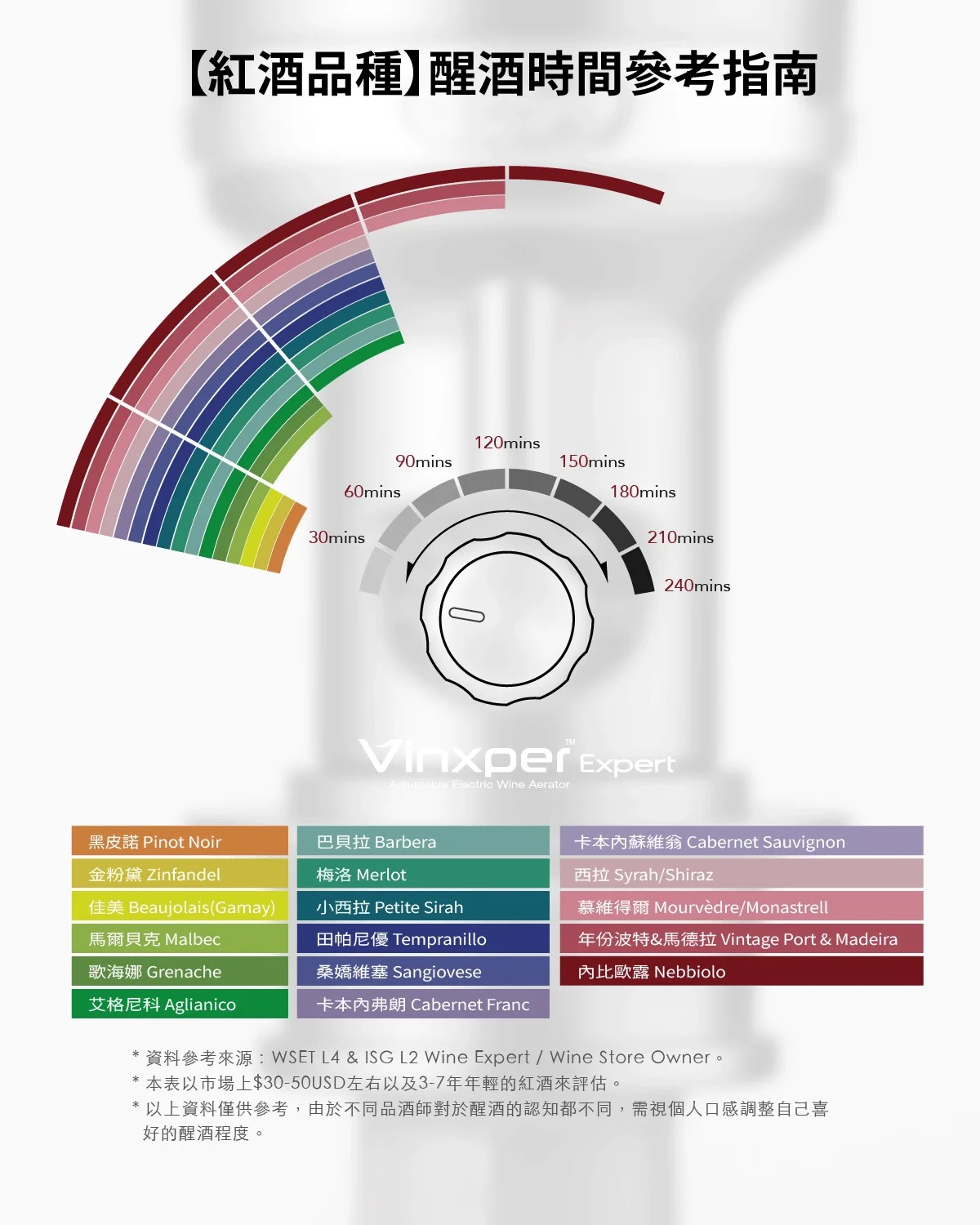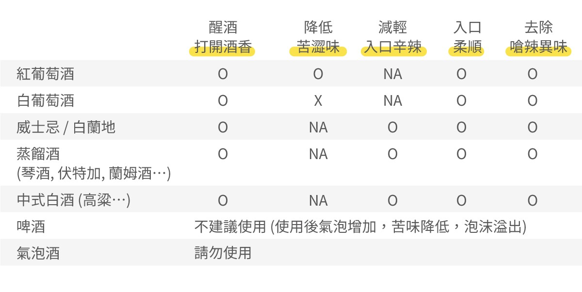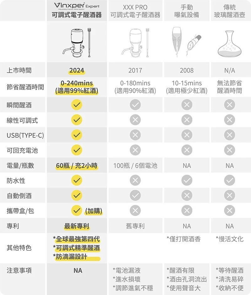 在全球多數的資料中顯示約99% 3~7年的年輕紅酒,醒酒時間大約為使用玻璃壺醒酒0-4小時。現在 Vinxper Expert 的專利技術,讓醒酒的時間可以 "自由且準確"調整到自己喜歡的口感風味。
