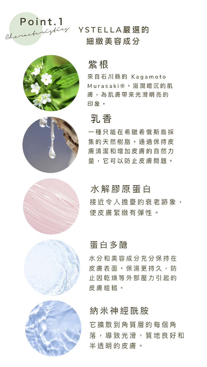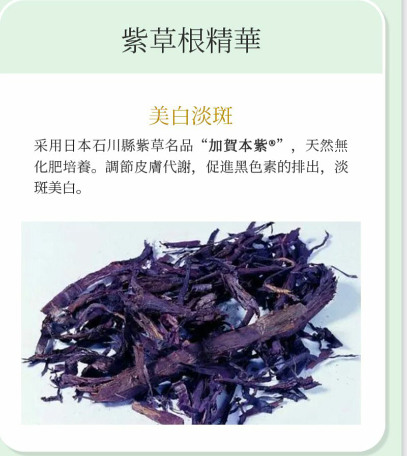 美白淡斑;采用日本石川縣紫草名品「加賀本紫」,天然無化肥培養。調節皮膚代謝,促進黑色素排出,淡斑美白。