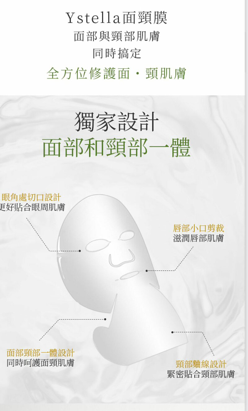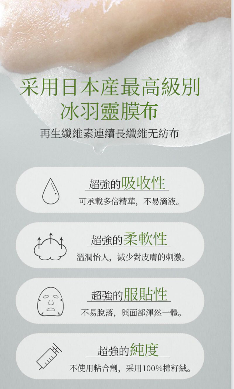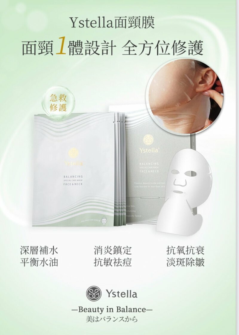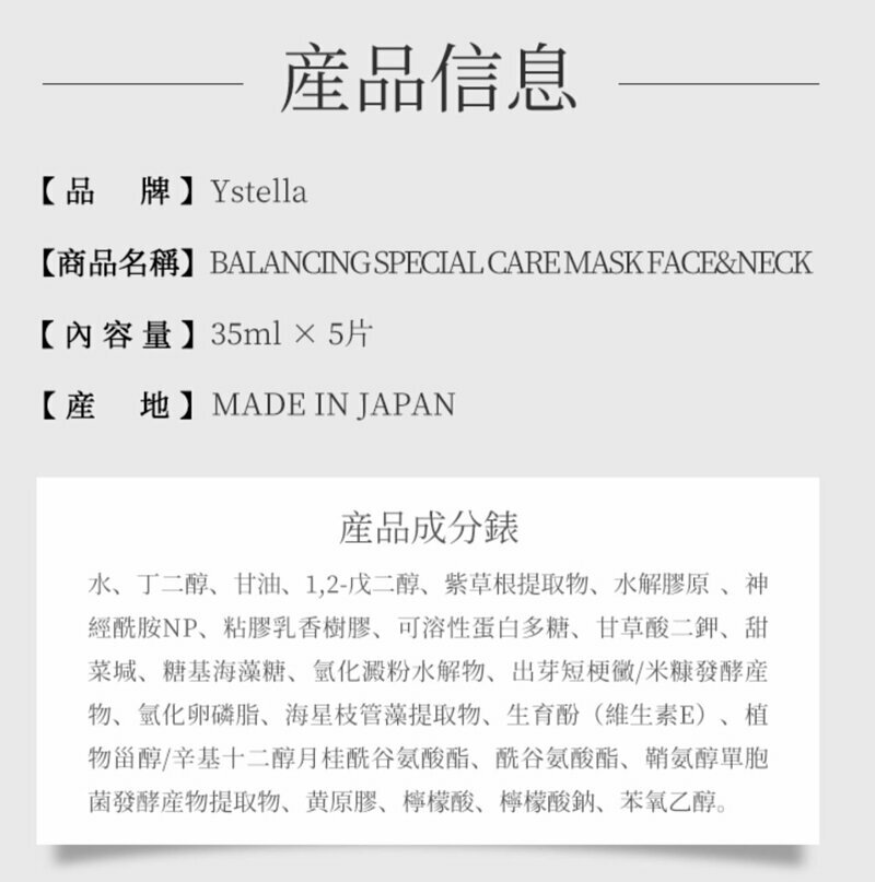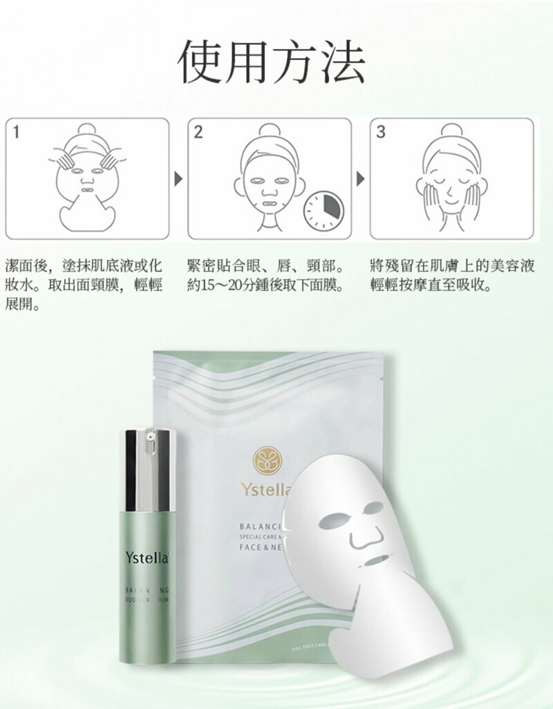 Ystella Balancing Special Care Mask - 冰羽靈膜采用日本產最高級別冰羽靈膜布,再生纖維素連續長纖維無紡布,超強吸收性可承載多倍精華;超強服貼力,不易脫落,剪裁與面部貼合。