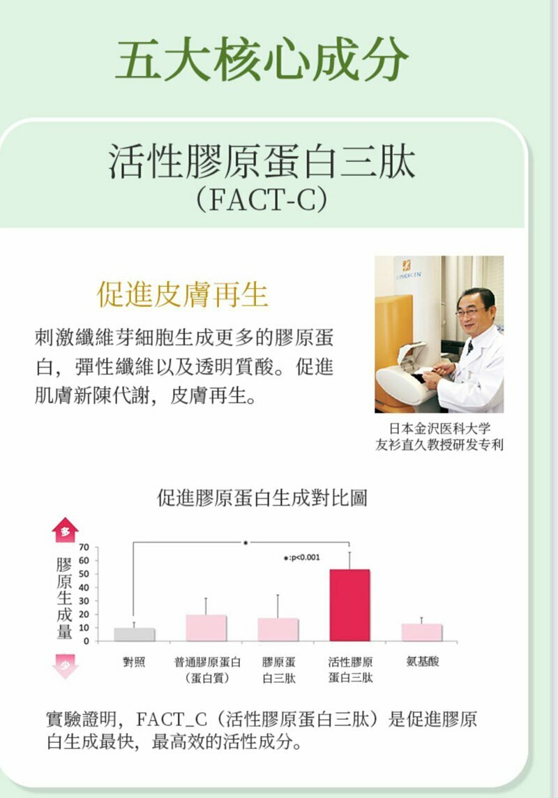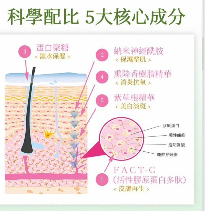 促進皮膚再生;刺激纖維芽級細胞生成更多的膠原蛋白,彈性纖維以及透明質酸。促進肌膚新陳代謝,皮膚再生。
