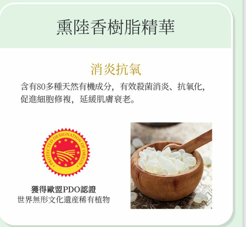 消炎抗氧;含有80多種天然有機成分,有效殺菌消炎,抗氧化,促進細胞修復,延緩肌膚衰老。