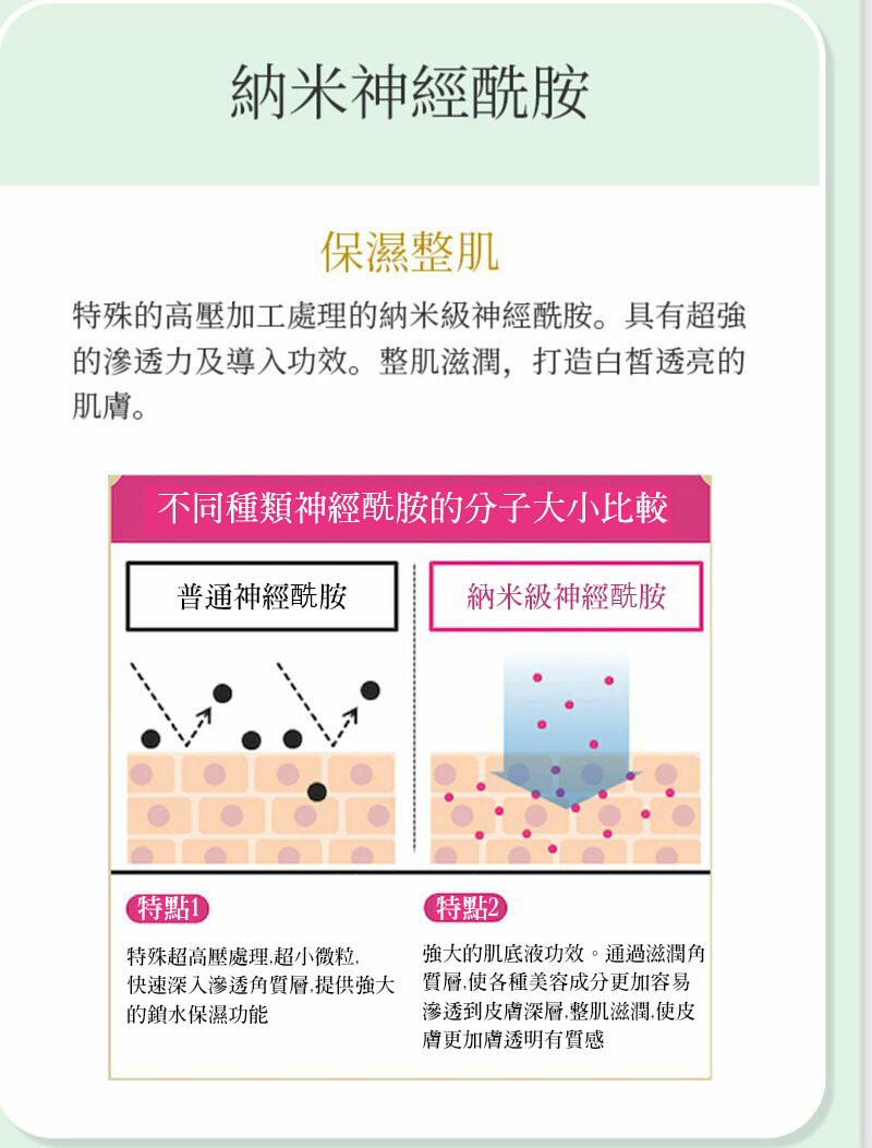 保濕整肌;特殊的高壓加工處理的納米級神經酰胺,具有超強的滲透力及導入功效。整肌滋潤,打造白皙透亮的肌膚。
