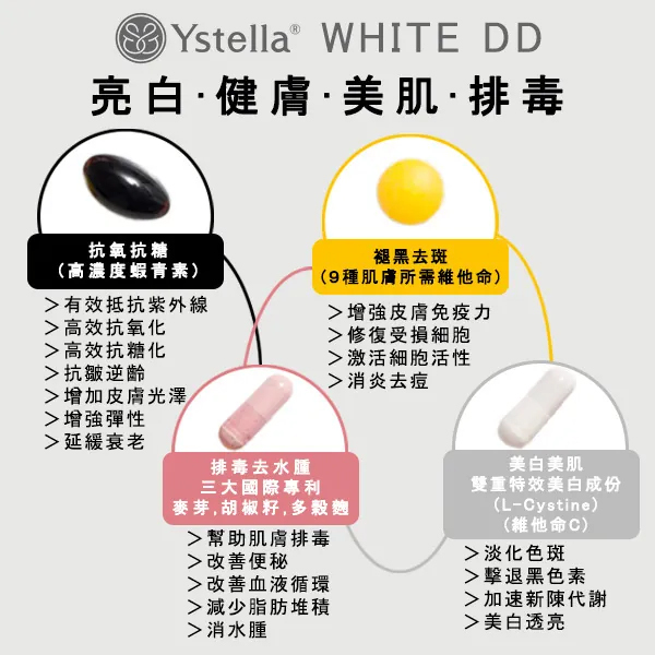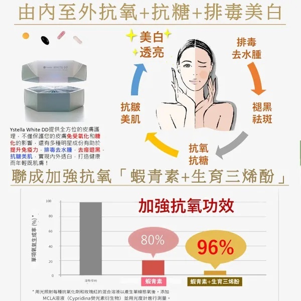 Ystella White Detox & Diet,主要成份有6mg蝦青素具有難以置信的抗氧化和抗糖化特性。它能夠中和自由基,