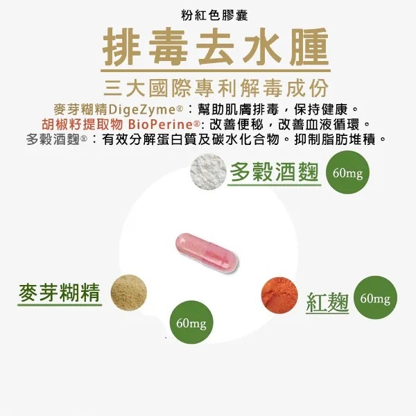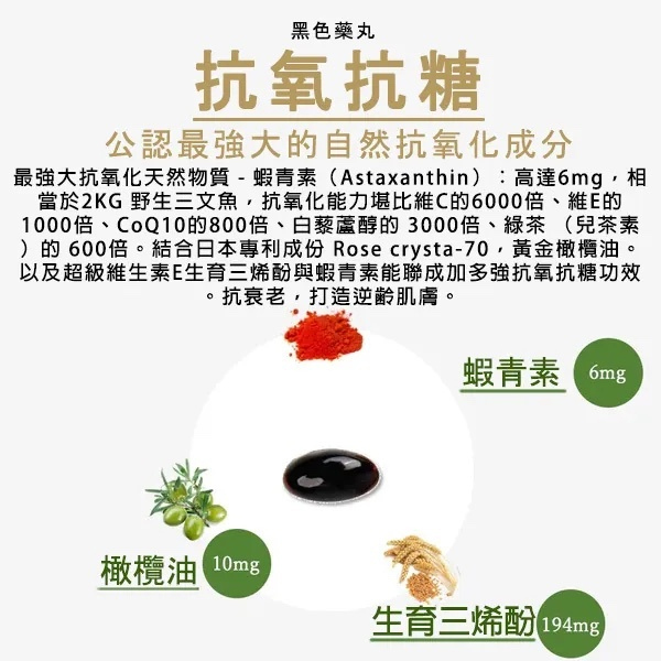 - 蝦青素 +生育三烯酚: 聯成加強抗氧抗衰老功效。